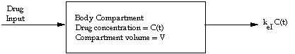 This approach models the entire body as a single compartment into which drug is added by a rapid single dose, or bolus. It is assumed that the drug concentration is uniform in the body compartment at all times and is eliminated by a first order process that is described by a first order rate constant kel. The model is shown in figure 3.5.1.