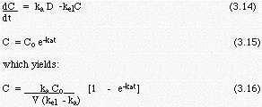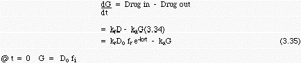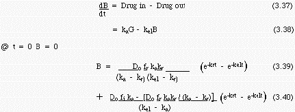 This reduces to the expression for oral administered dose with an absorption term, equation (3.16) when fr = 0 and fi = 1, and B = CB Vd. Experimentally one can measure fr, fi and kr in vitro for a sustained release formulation and measure CB (plasma concentration) after administration in animal or human. These data are then fit to find kel, ka and Vd. An example that appeared in the literature was given by Wiegand and Taylor (1960) Biochemic. Pharmacol. 3: 256 for the drug 1-(o-methoxy propyl)-4-(g-methoxypropyl) piperazine phosphate.
