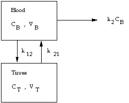 In the two compartment model, again a rapid bolus of drug is assumed. Also a first order transfer is assumed between compartments and first order elimination from the blood compartment, with no elimination or metabolism in the tissue. The scheme is outlined in figure 3.5.5.