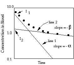 This represents the biexponential semilog concentration/time plot that is expected with the two compartment model and is shown in figure 3.5.6.