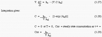 Drugs are not always administered by a rapid bolus, as assumed in these models. A frequent mode of drug administration is by a continuous intravenous infusion, In this case a steady state of plasma drug concentration is achieved. For the one compartment model, we assume a zero order infusion rate constant ko. The analysis follows: