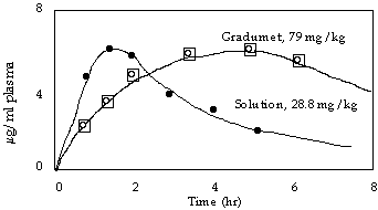 Figure 3.5.8. Comparison of sustained-release tablet and solution kinetics in six dogs. Initial dose is shown on the graph.