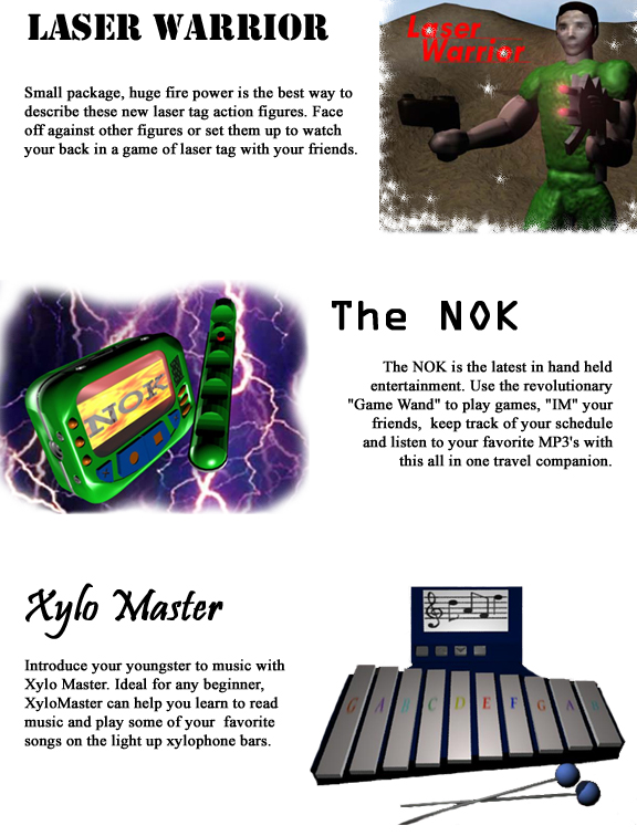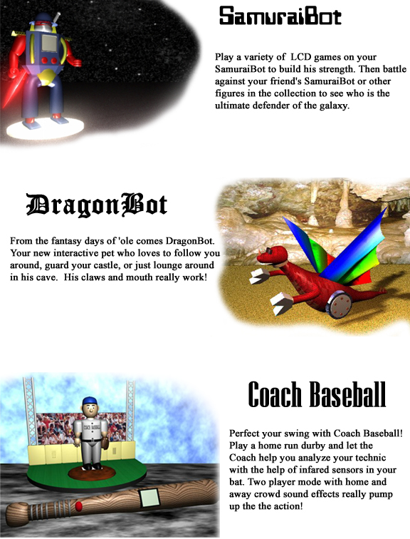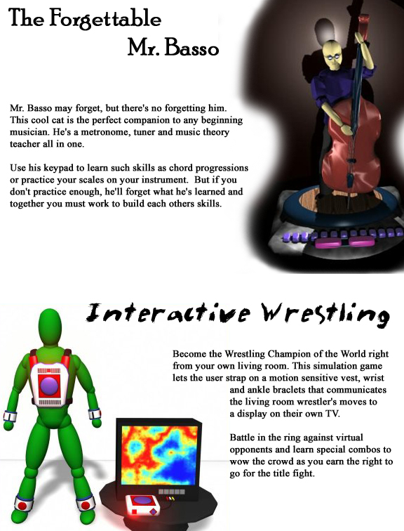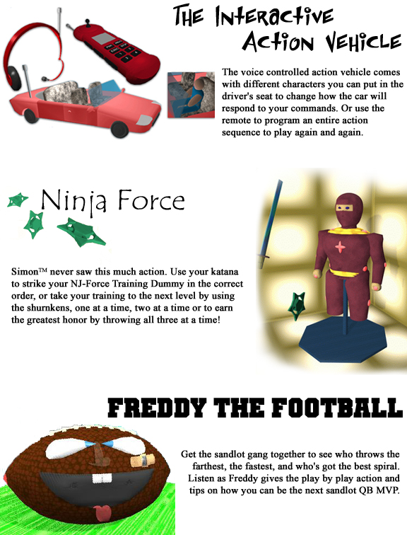 | Although the students designs are entirely conceptual, they are taken very seriously. Every semester the top designs from the course's almost 200 students are chosen by the instructors and presented to professional toy makers. From the presentations the toy makers may even decide to pitch the students' ideas to toy manufacturers and the toy design could become a reality. Take a look below at some of the past years best. |